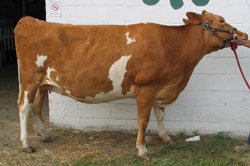 GUERNSEY - this breed was developed on an island in the English Channel to produce high fat milk for making butter, This breed is known for its gentle nature, and yellow-tinted milk. Fawn and white markings characterize this breed.
